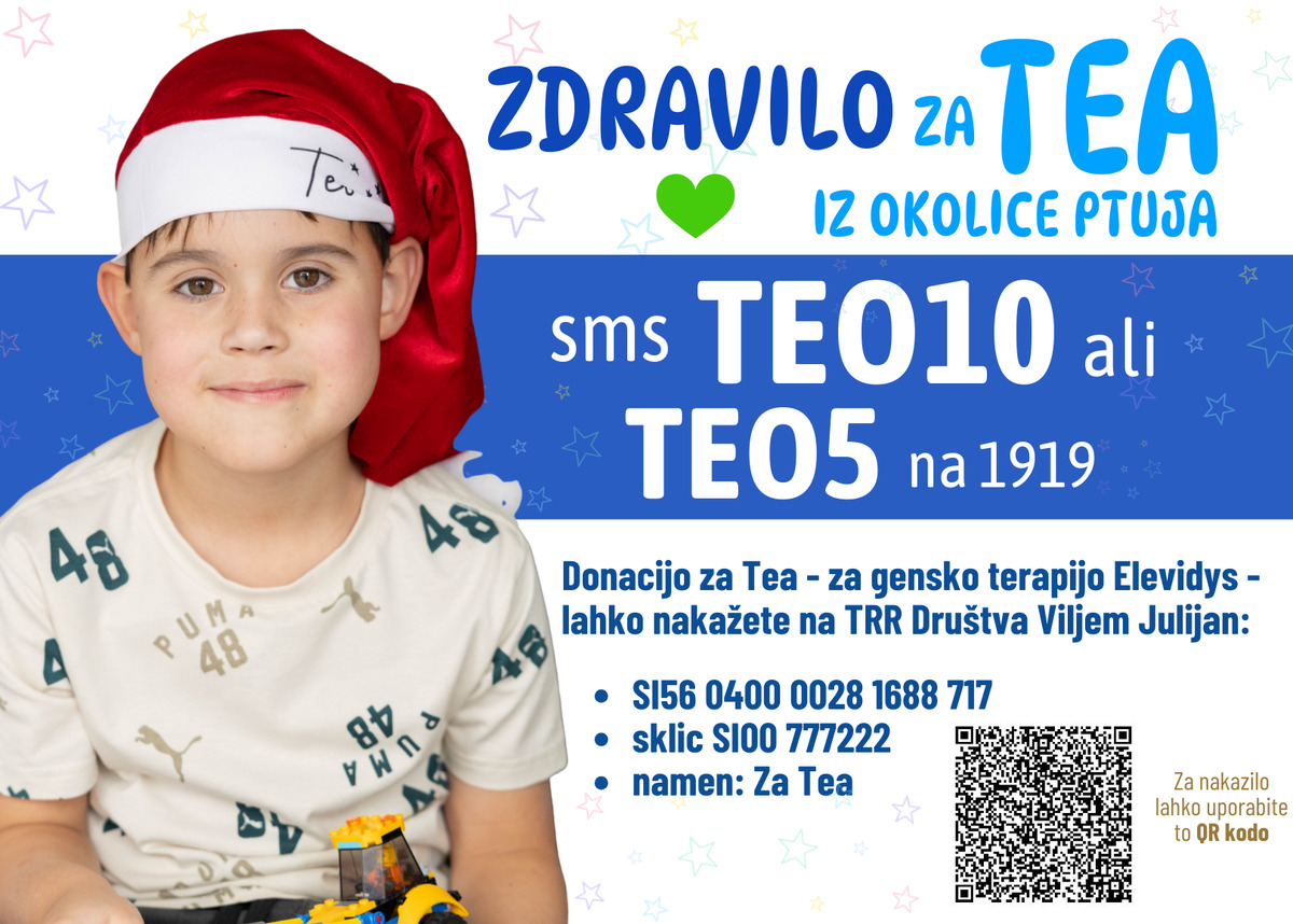 V ZDA je odobrena genska terapija Elevidys, ki bolnikom s to boleznijo prinaša novo upanje. Žal pa je zdravljenje izjemno drago in stane 2,5 milijona € (2,9 milijona $). Edina možnost, da bi Teo lahko prejel to zdravljenje je, da njegovi starši s pomočjo donacij zberejo potrebna sredstva. V sodelovanju z Društvom Viljem Julijan smo zato začeli z zbiralno akcijo in se s srčno prošnjo obračamo na ljudi, da Teu pomagamo do zdravila. Pri tem pa je čas ključnega pomena, saj mora zdravljenje prejeti čim prej.